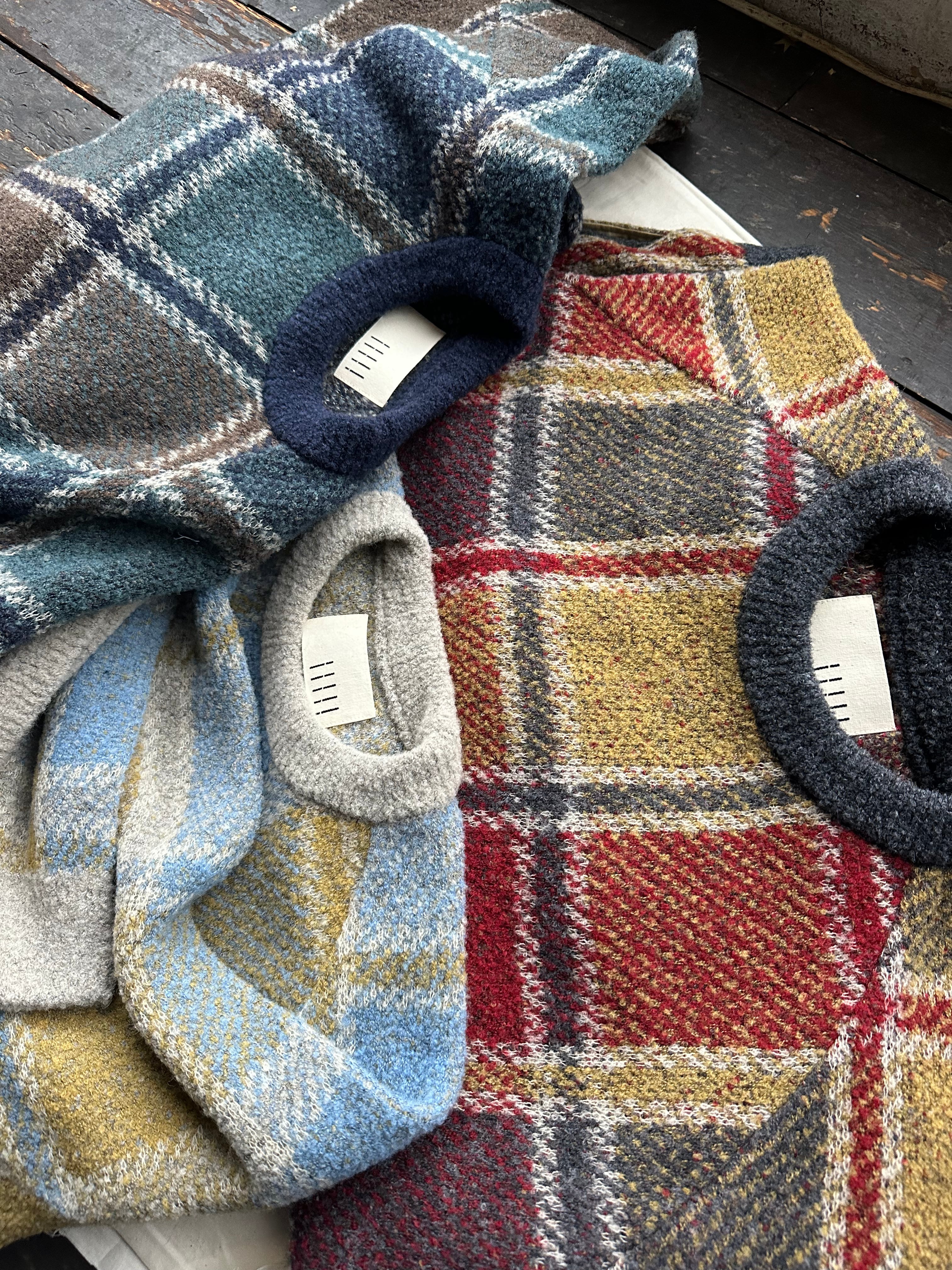 「チェック柄プルオーバー」は、伝統的なマドラスチェックを現代的にアレンジして、モダンさが融合したニット。素材の軽さと柔らかさ、国内最高峰のニット工場の技術が詰まった一着。シンプルながらも印象的なデザインで、ユニセックスで楽しめるアイテムです。