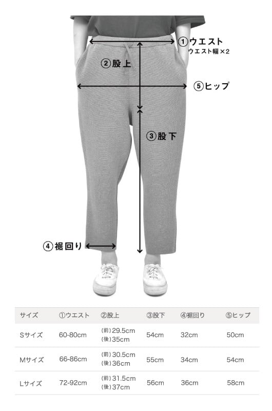 ウエスト x 股上(前) x 股上(後) x 股下 x 裾回り x ヒップ
