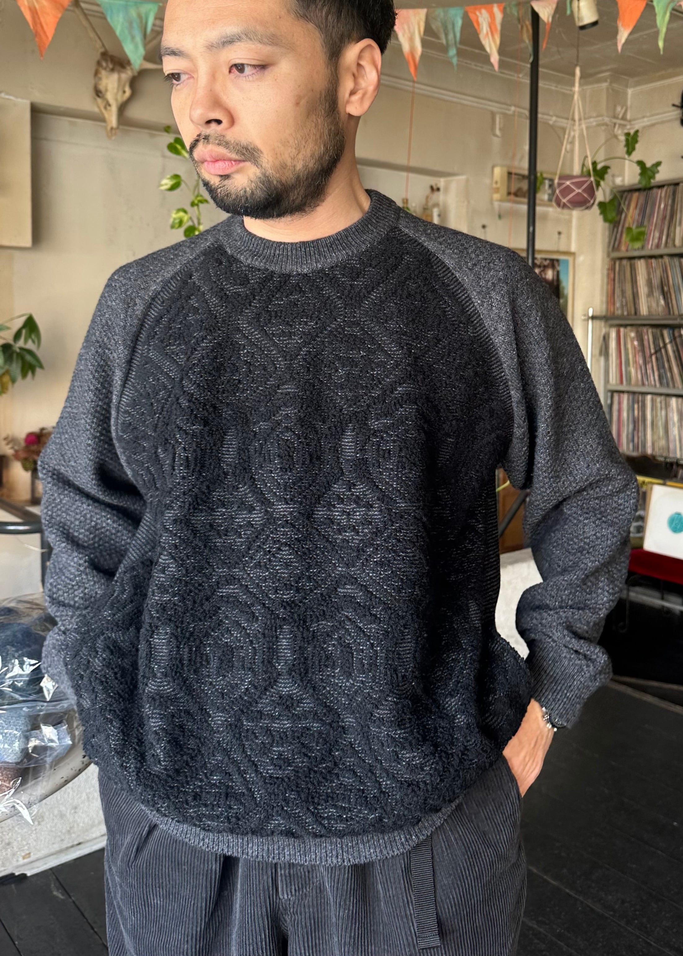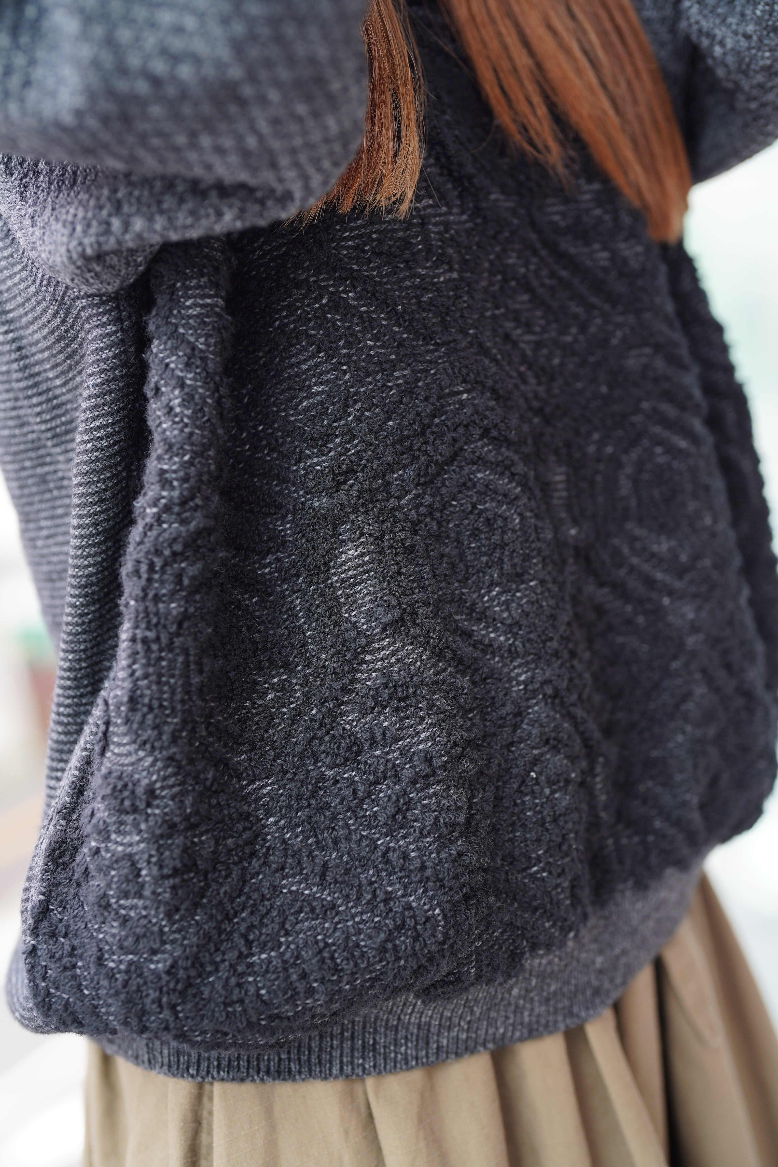 フロントの編み地は「パイルジャカード」。どことなく民族的な雰囲気も漂う編み地。袖パーツは、ボツボツとした「リンクス柄」。編み地の立体感で柄を表現してします。