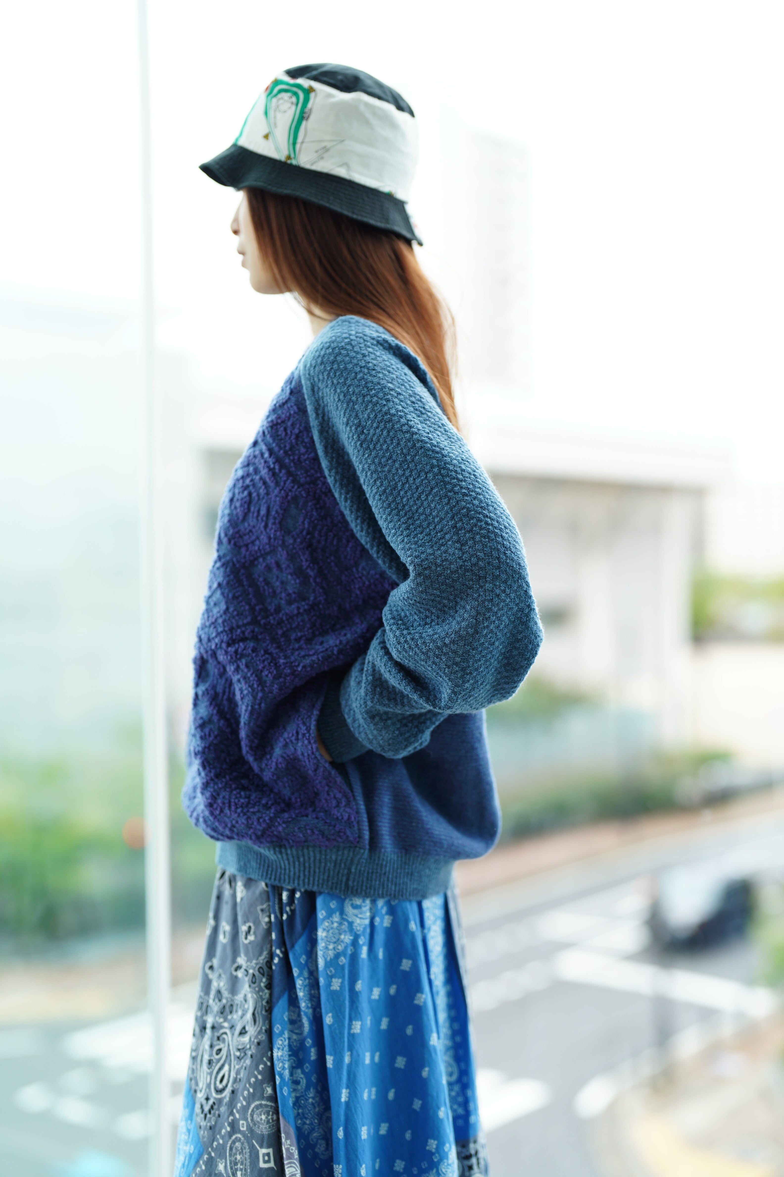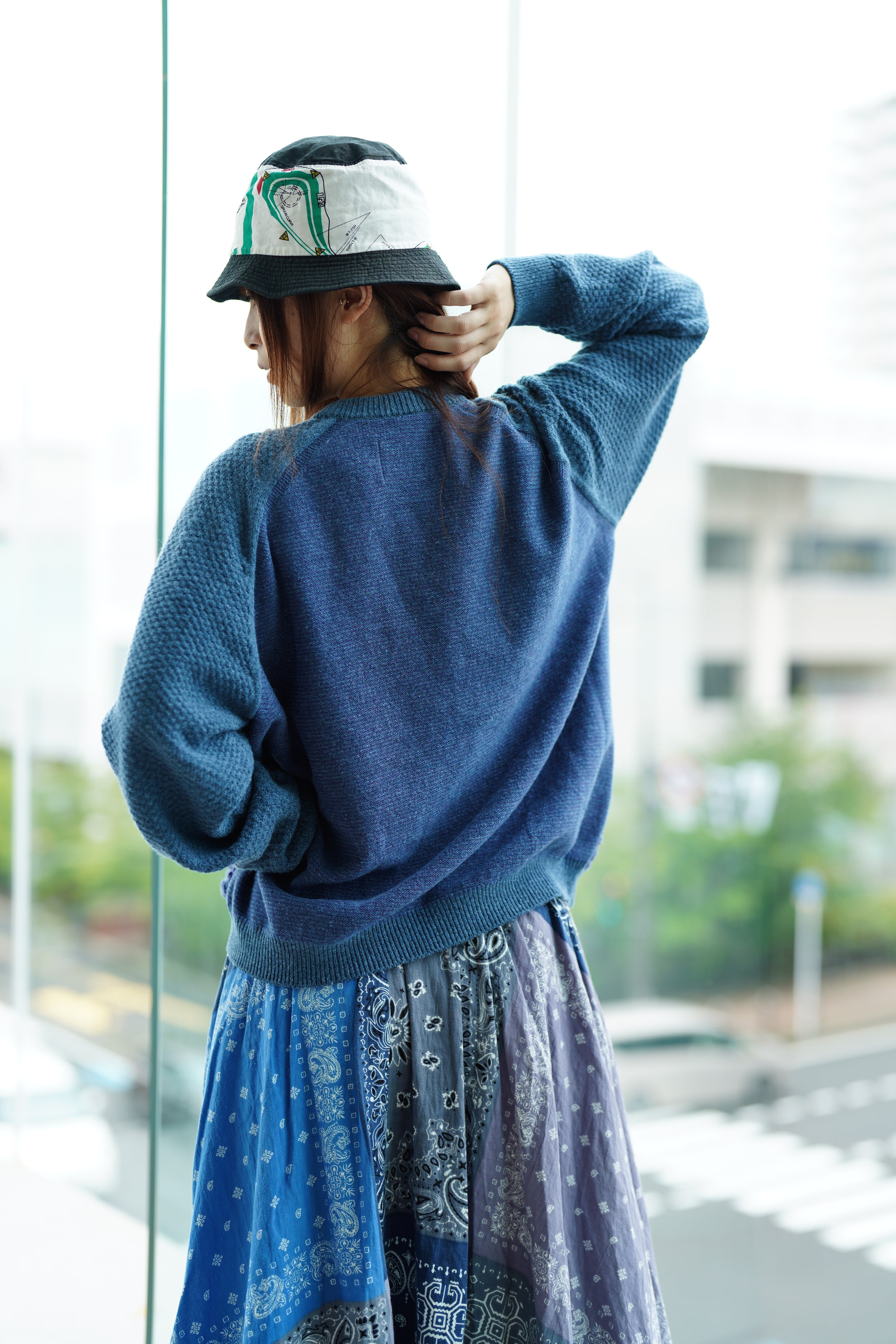 フロント、バック、袖、それぞれ異なる編み地。編み地が異なるので、見える角度によって異なる印象になるユニークなニット。手持ちのワードローブにすんなりと溶け込みながらも、誰かと同じコーデになることのない一着。