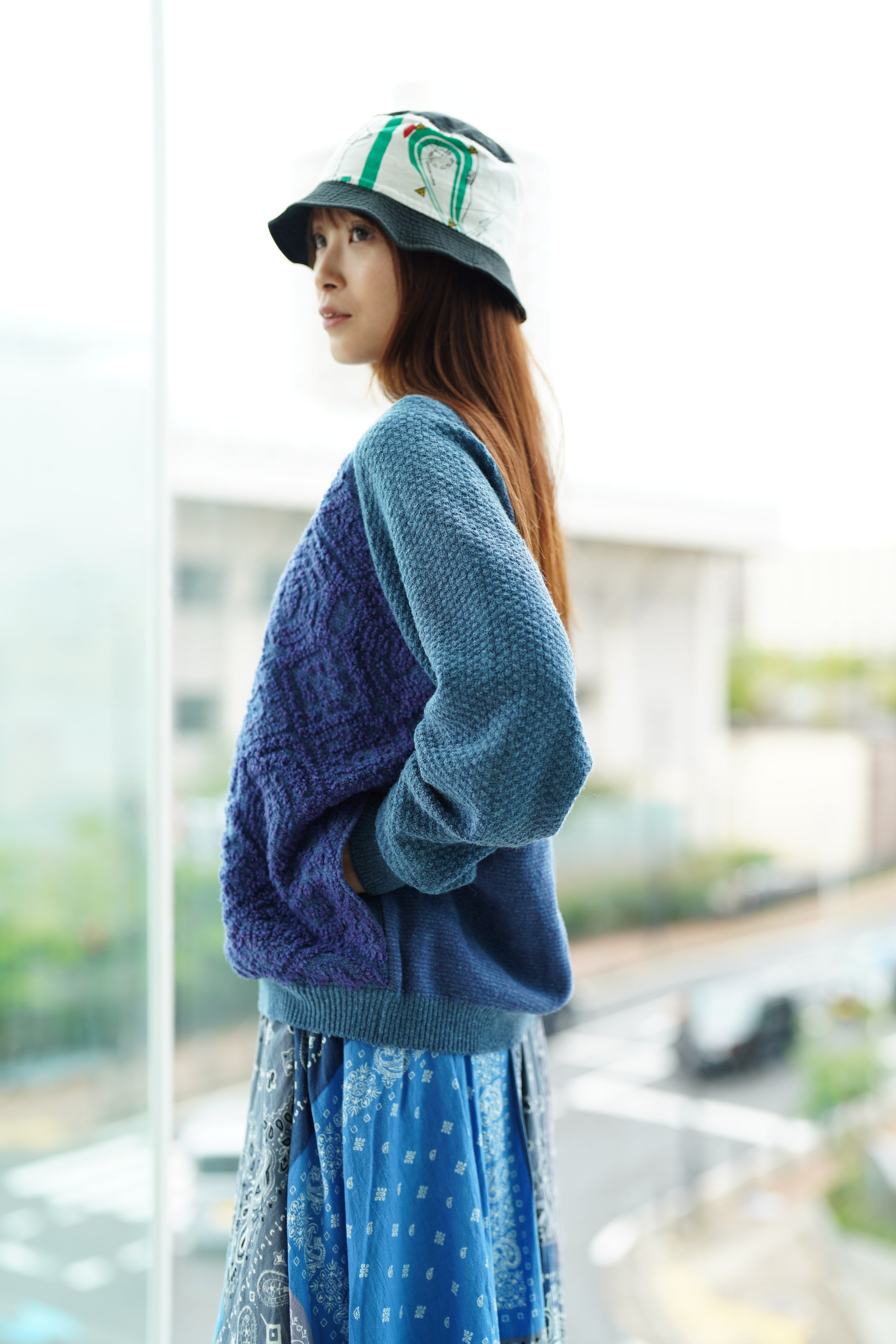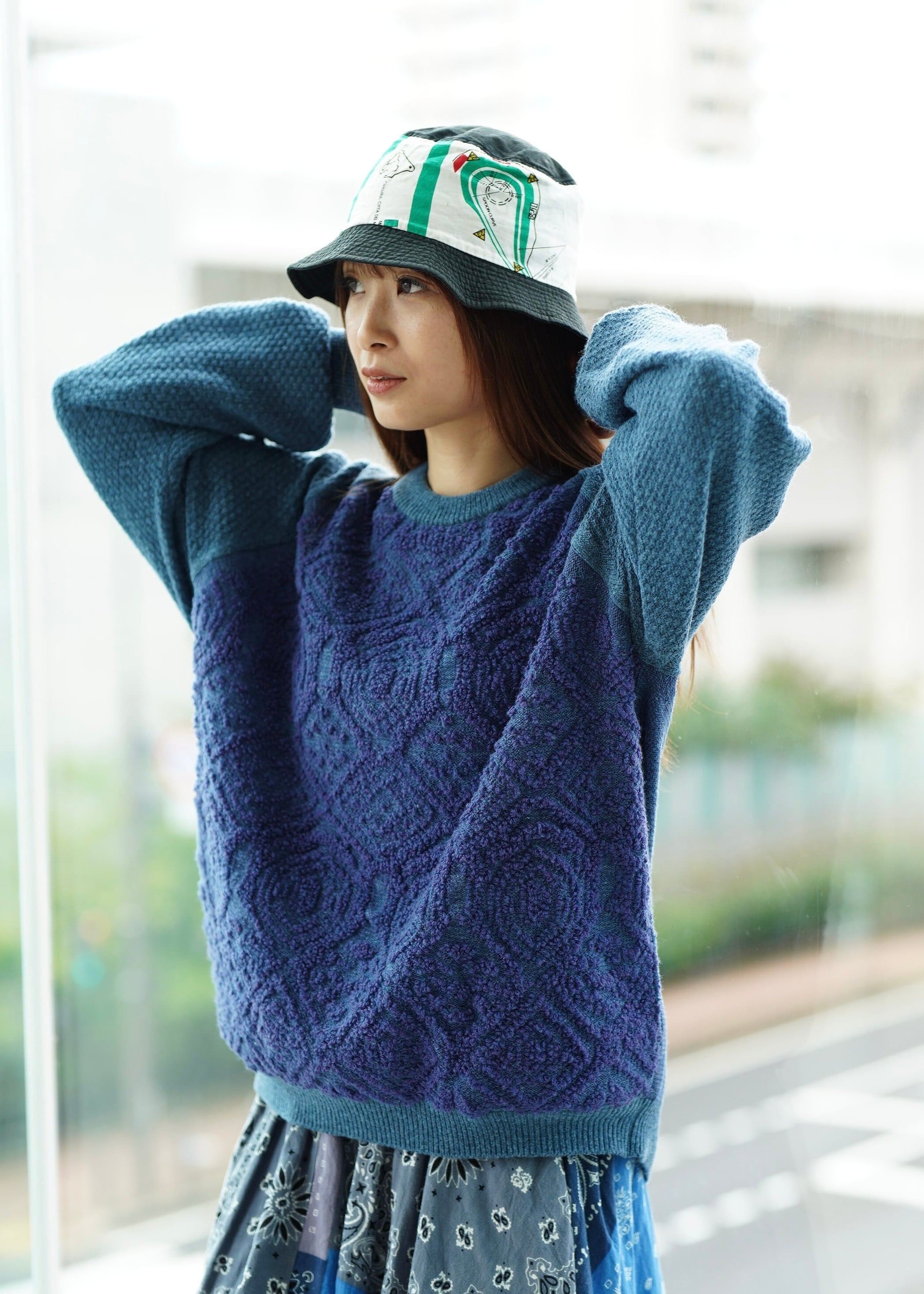フロントの編み地は「パイルジャカード」。どことなく民族的な雰囲気も漂う編み地。袖パーツは、ボツボツとした「リンクス柄」。編み地の立体感で柄を表現してします。