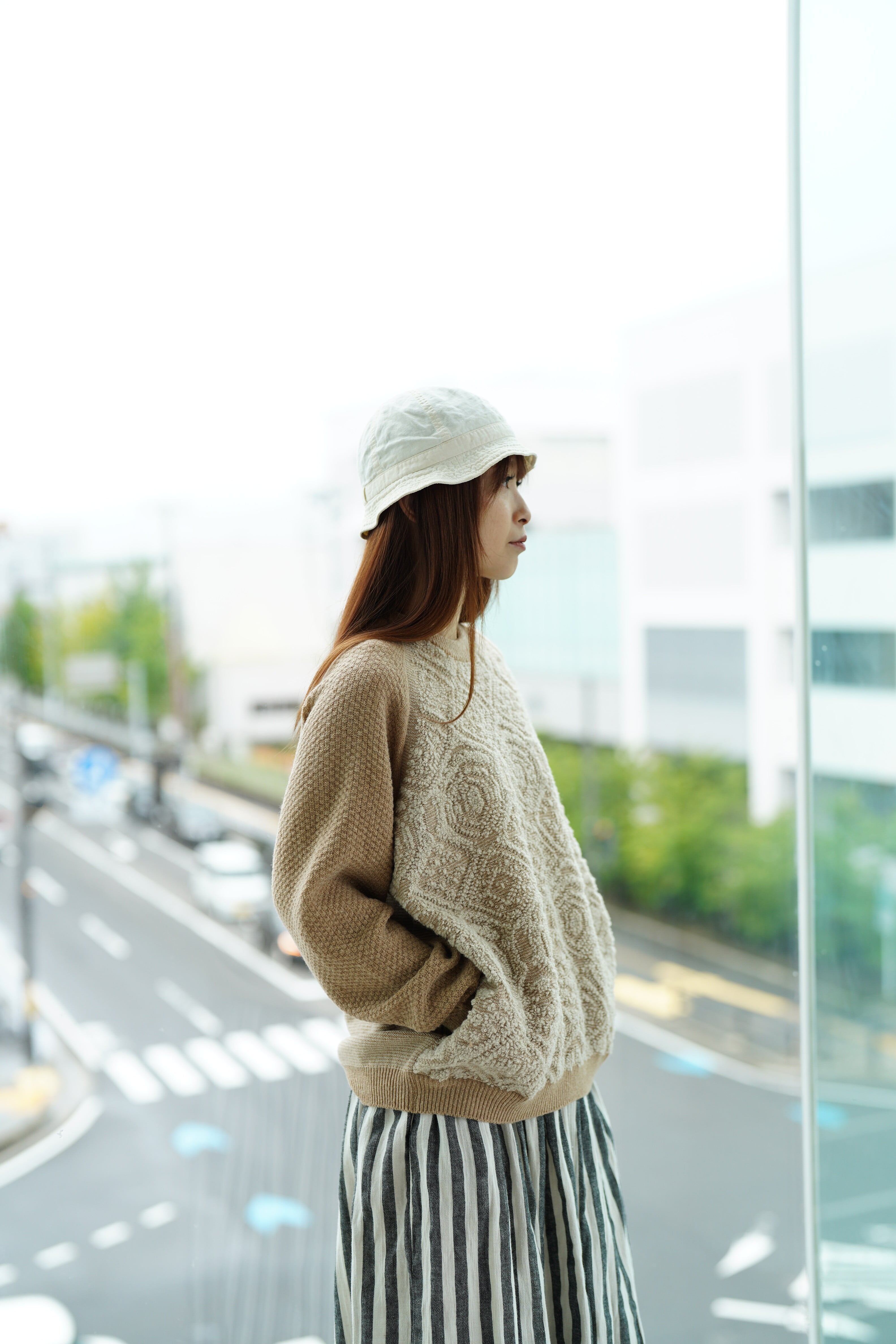 フロントの編み地は「パイルジャカード」。どことなく民族的な雰囲気も漂う編み地。袖パーツは、ボツボツとした「リンクス柄」。編み地の立体感で柄を表現してします。